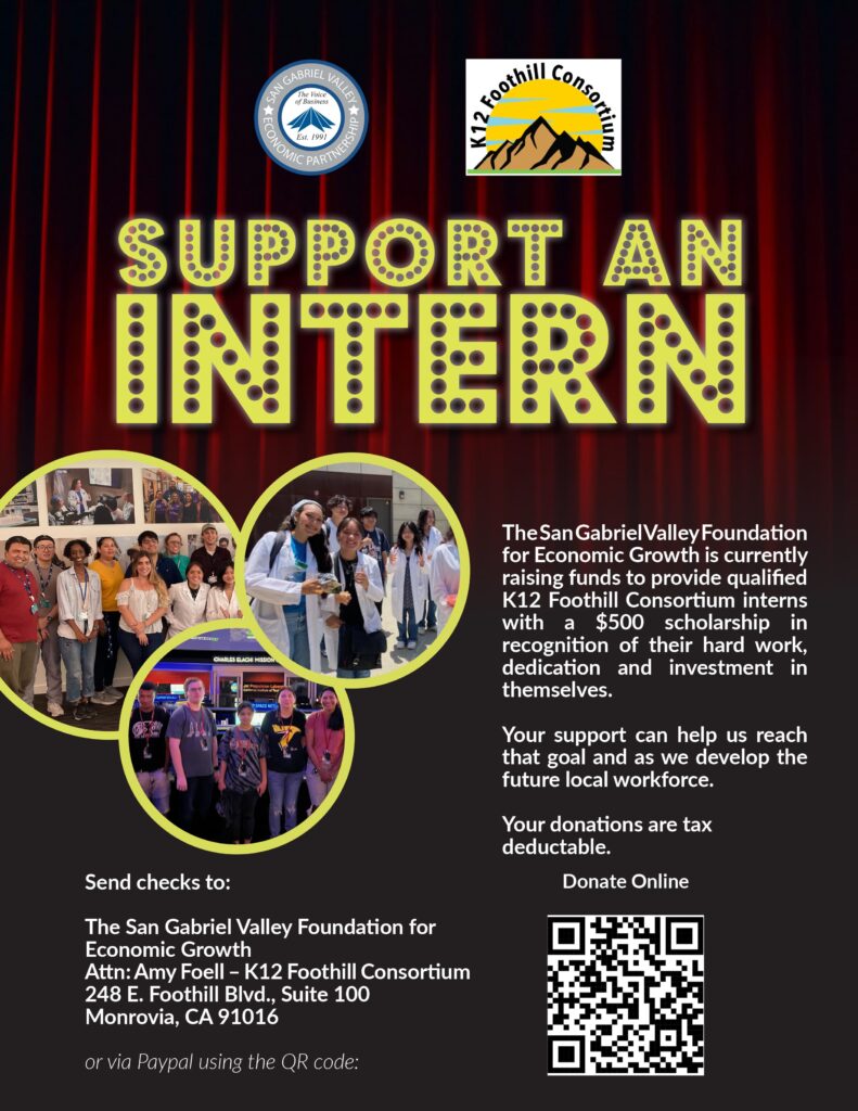 $300 is what it takes to provide one scholarship to a K12 Foothill Consortium 2024 Summer Intern. We have 72 of them! This is our largest group of summer participants since we started in 2020. Over the years, we’ve distributed $40,000 in scholarships to students choosing to invest in themselves during the summer in a professional context. This summer we currently have $8000.00 to kick start our fundraiser big thanks to the Azusa Leaders Foundation and the Pasadena Community Foundation. All donors will be honored at the Intern Celebration & CTE EXPO on September 26 from 5pm to 7pm in Azusa. Please give today. Every dollar makes an impact.